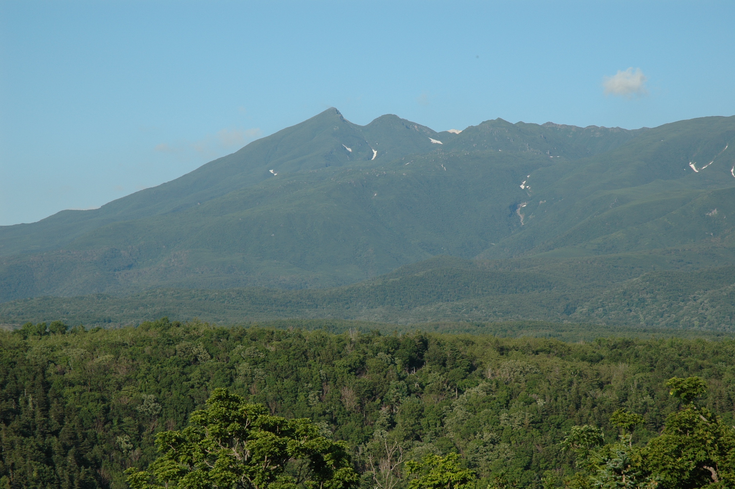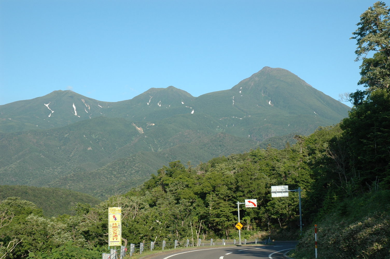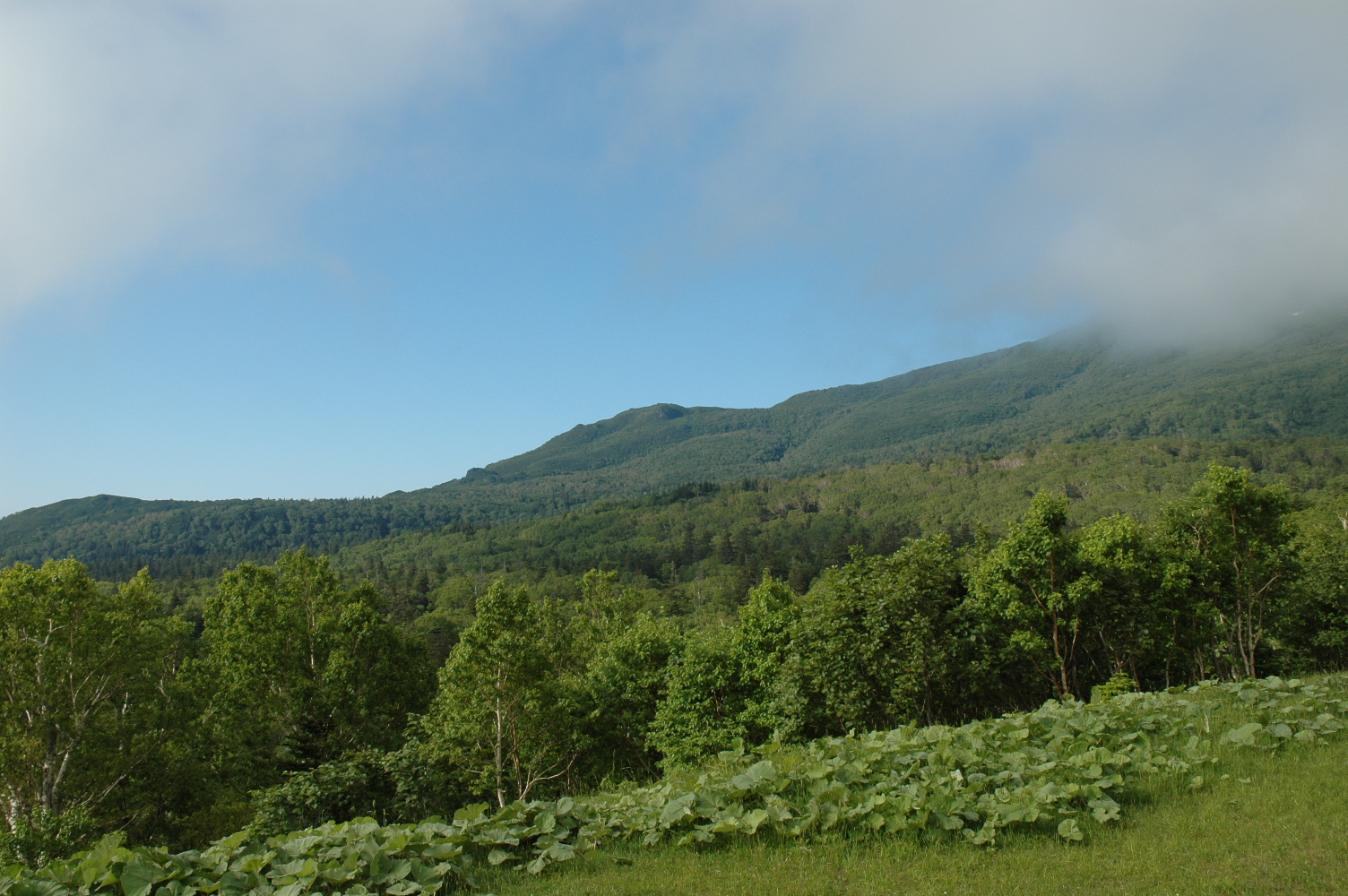 知床峠付近で雪渓をみて彼は驚嘆し、峠までガスっていましたが峠を越えたら晴天です。