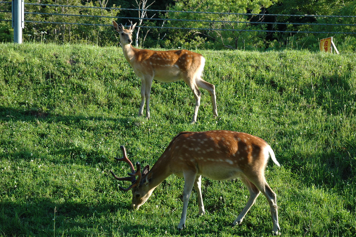 ウトロの海が見えたところでエゾシカ2頭に遭遇。