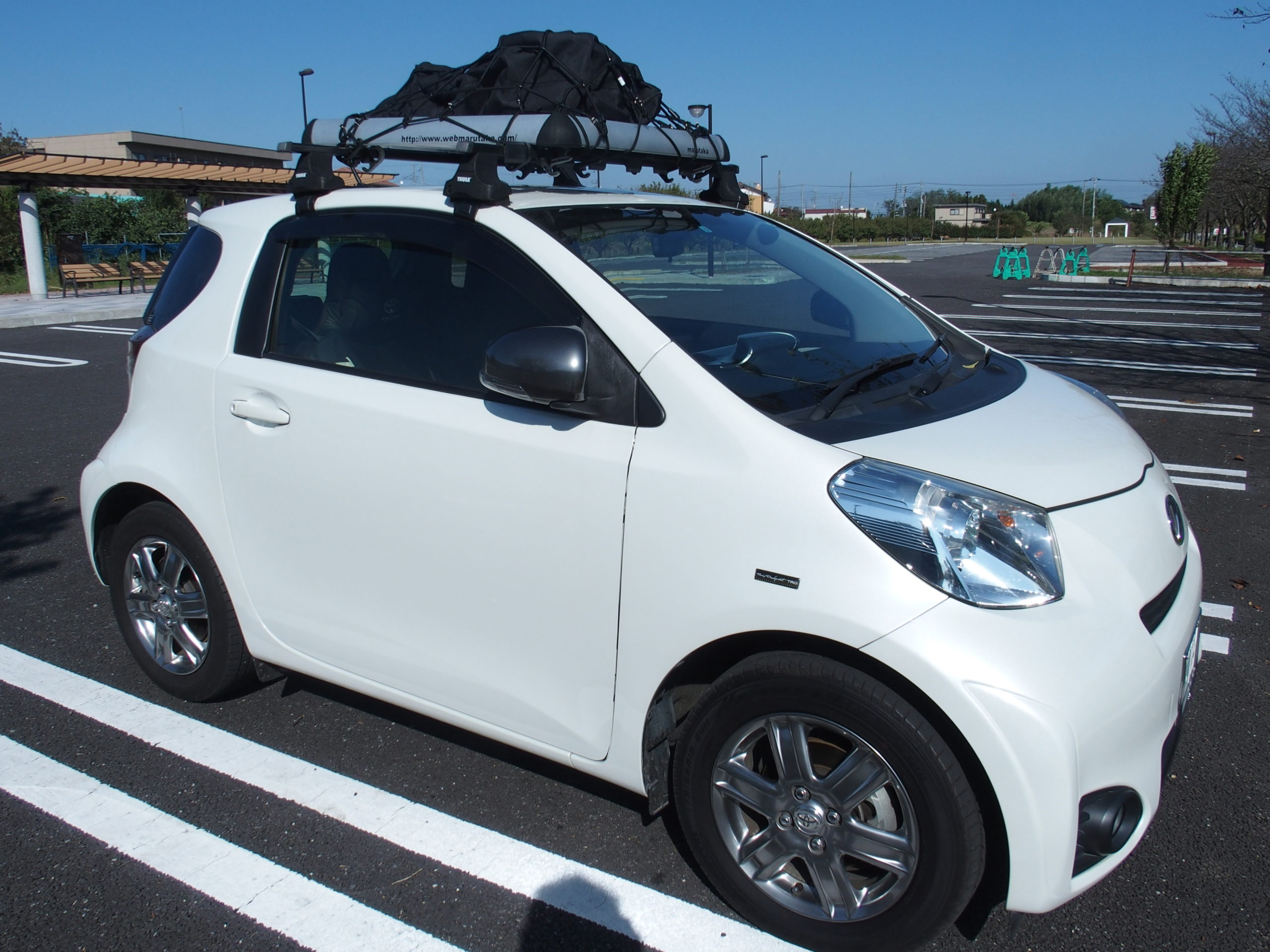 ドライブの時には、Thule社製ルーフキャリアをMy まる高Q(TOYOTA iQ 130G MT)に設置し、ヤフオクでGetしたThule社製ルーフラックをキャリアに架装します。