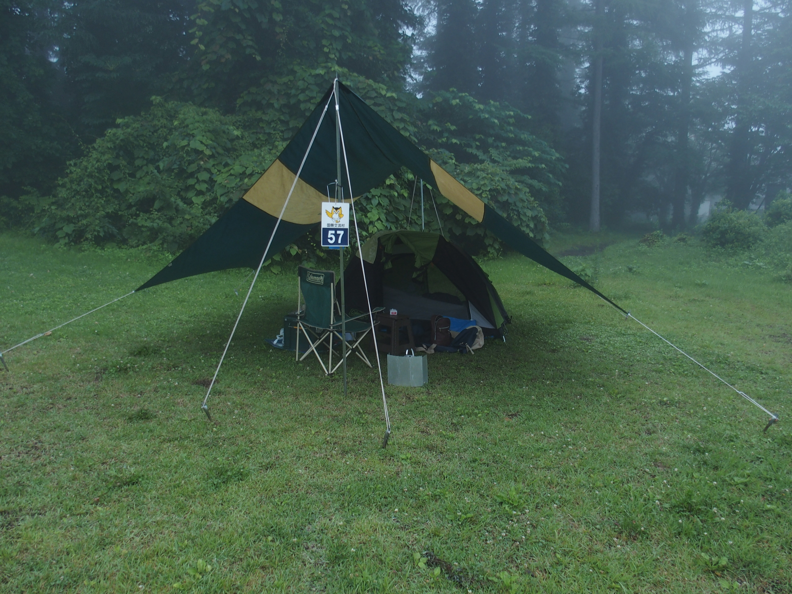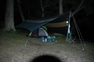 土砂降りの雨が降る予定(実際、そうなりました)なので、タープの中にテントを張りました。