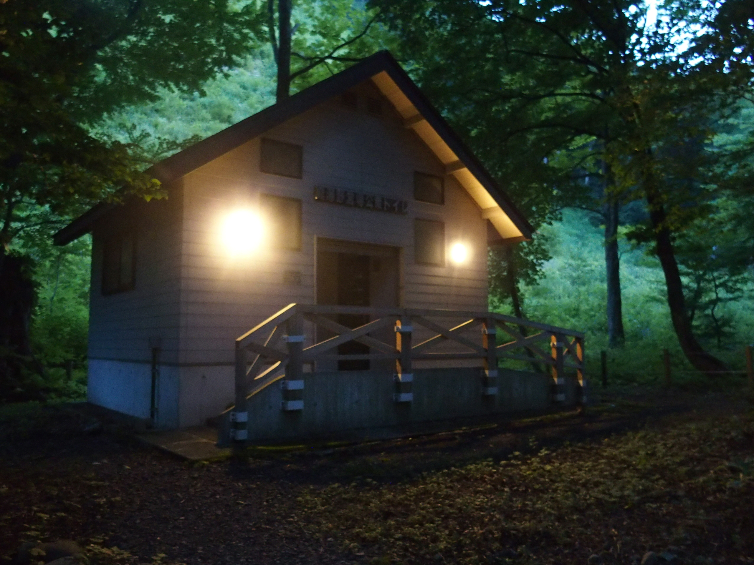 無人の管理棟、一晩中点灯。