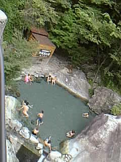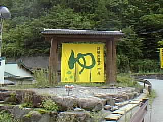 - 2003年・夏、兄弟サイト「インターネットで競う、まる高マラソン大会」から生まれた「チームまる高」の合宿で、「宝台樹キャンプ場」から走って14Km先の「湯の小屋 - 仁王の湯」にて汗を流しました。ロックフィル型の「奈良俣ダム」の近くにあり、川に面していて男女別になっています。透明の程よい温度の温泉です。温泉の名前にあやかって、川原に向かって仁王立ちを試みました。おりしも家族連れ(若い夫婦とお子さん一人)が川原を散策していました。奥さんが眩しそうに小生のイチモツをチラッチラッと盗み見していたようです。(小生もまだまだくたびれていないぞと、自信を持ちました)